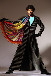 Men s Collection by Rizwan Beyg (Aug 2011) Pakistani fashion designer Rizwan Beyg has tested his hands in menswear designing first time with intension to produce something unusual but captivating. His latest men’s collection includes golden vertically striped black and rich golden mukeshed purple cloaks that look cool and different on men. the attires have distinct tailoring lines